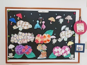 6月の壁飾りは、紫陽花を作製し、とっても可愛いくできあがりましたよ~