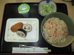 3日のメニューは、巻き寿司&稲荷ずし 味噌あんかけうどん ブロッコリーのマヨネーズ和え ヨーグルト でした。