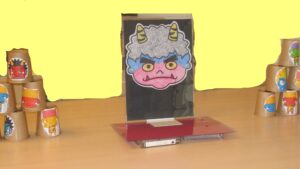 おじゃみを投げて、鬼を倒すと、おかめちゃんになり得点が入ります。